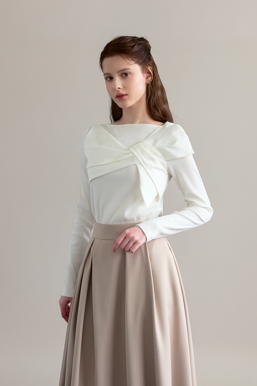 - [4차리오더] 로라 트위스트 오프숄더 탑 [아이보리]
