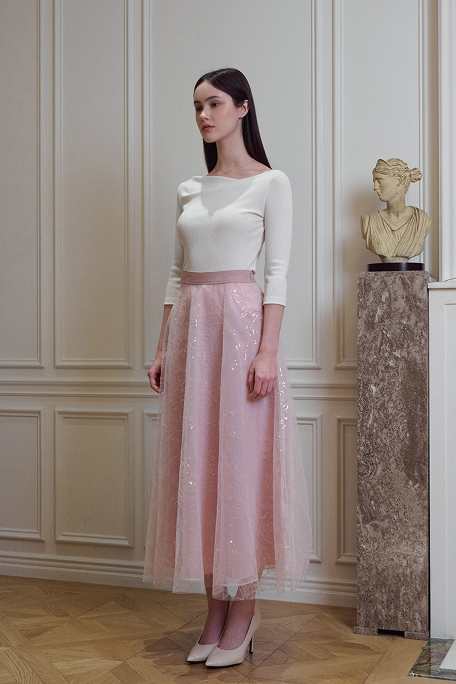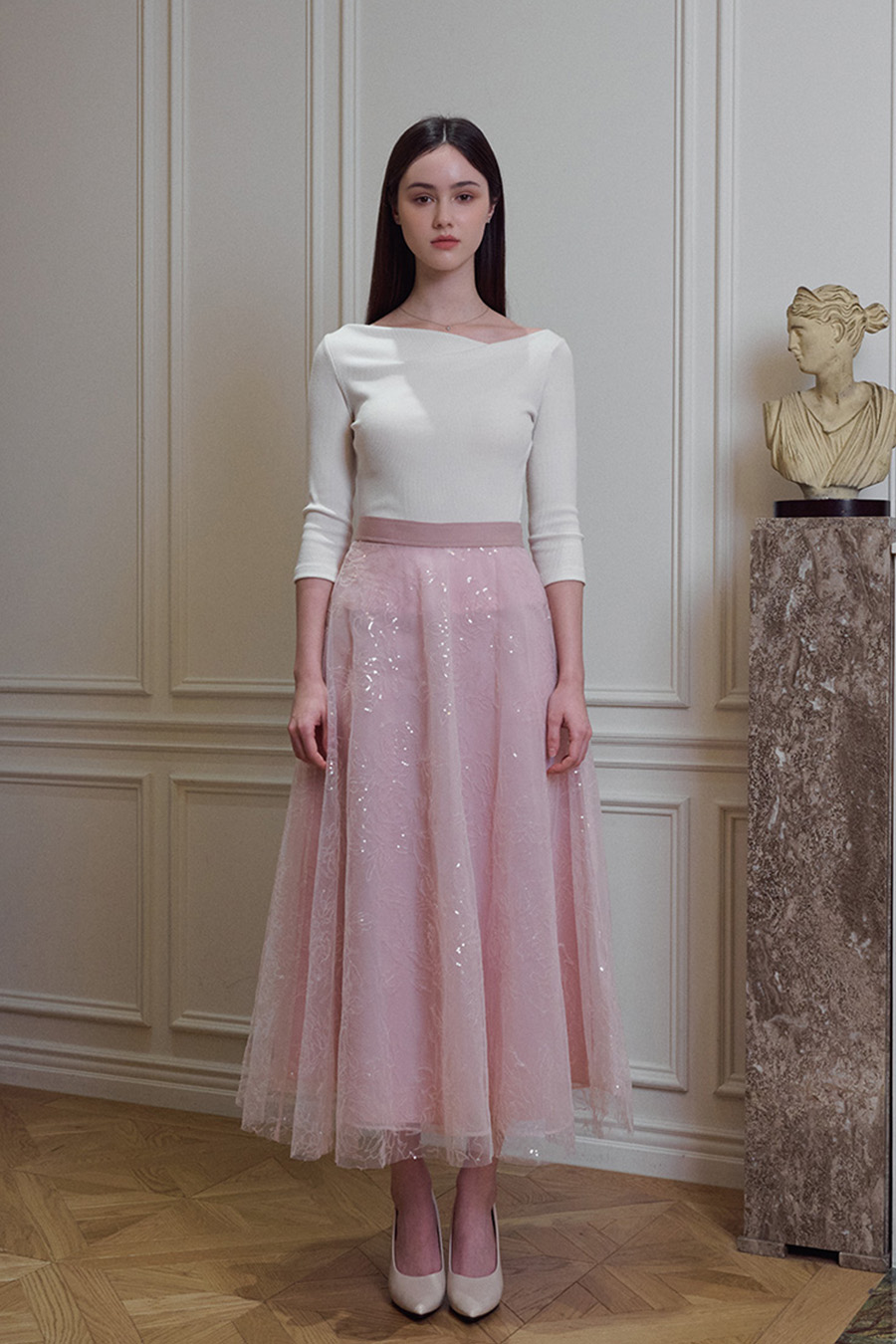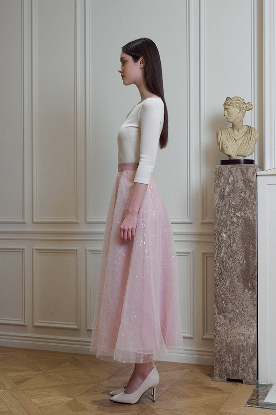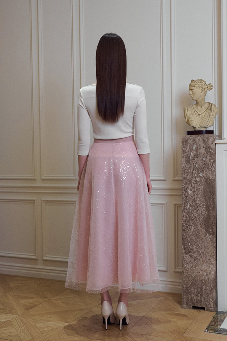 장미 문양의 스팽글 원단이 돋보이는 플레어 라인의 고급스러운 꾸뛰르 스커트입니다.