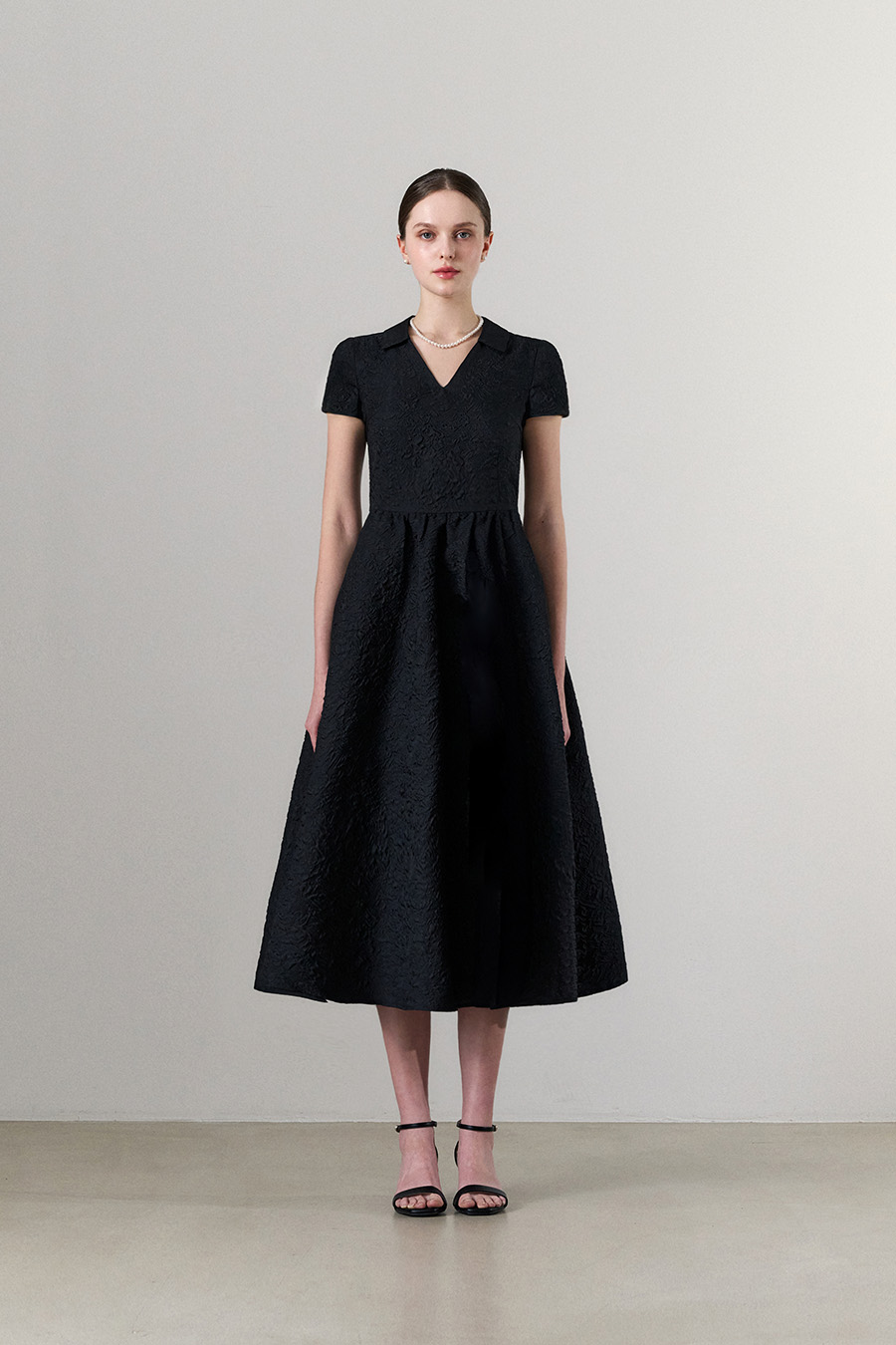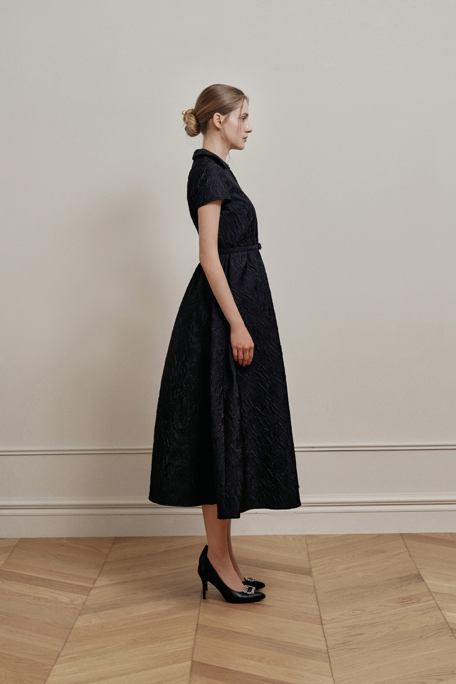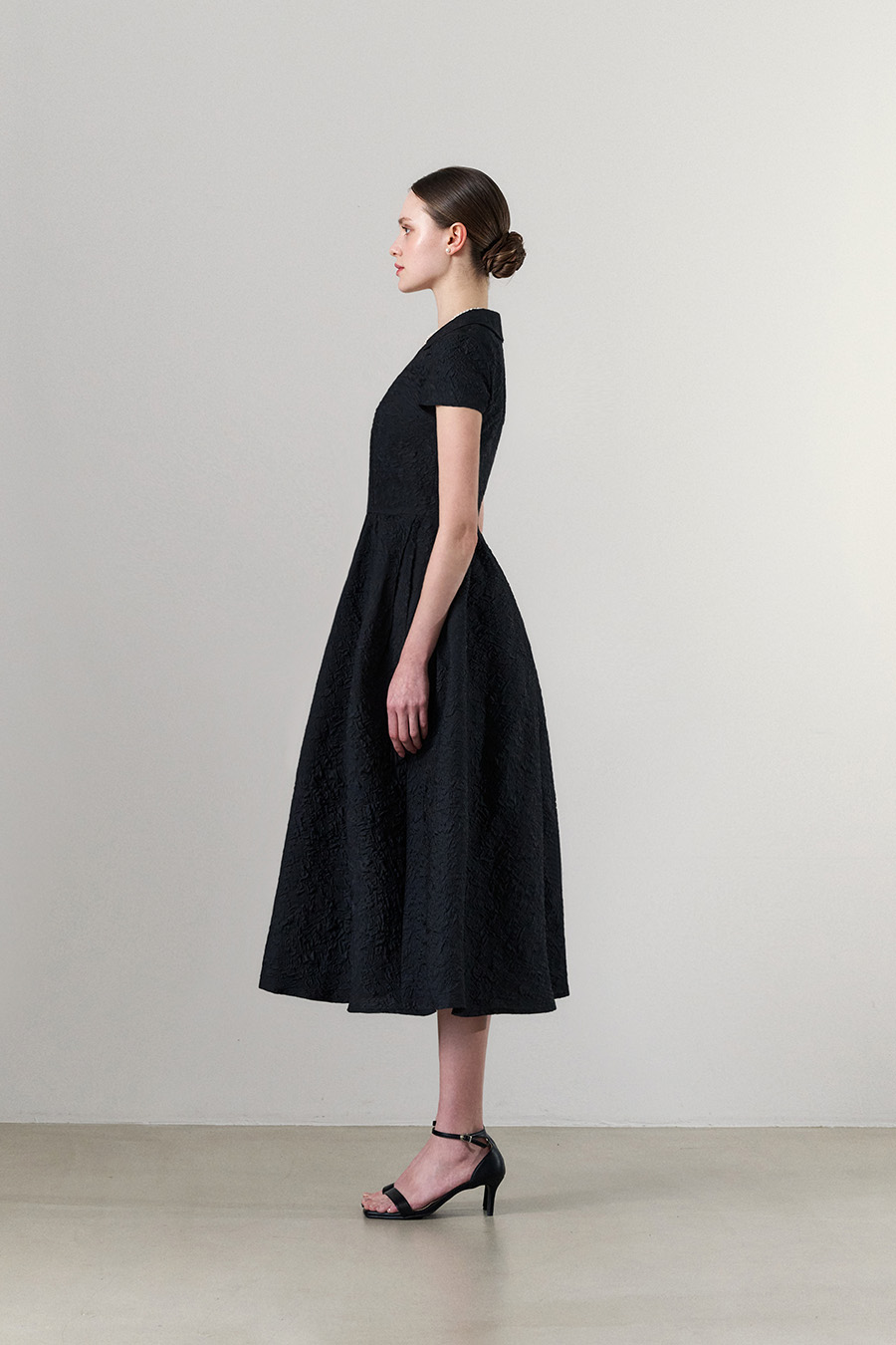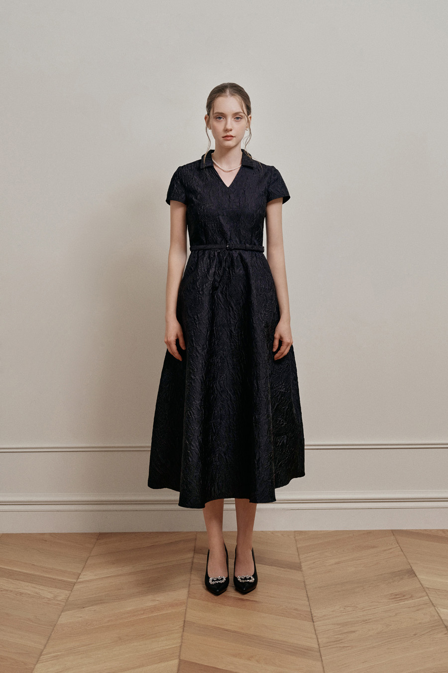 허리선을 따라 잘록하게 잡히는 실루엣과 풍성하게 퍼지는 플레어 라인의 스커트는