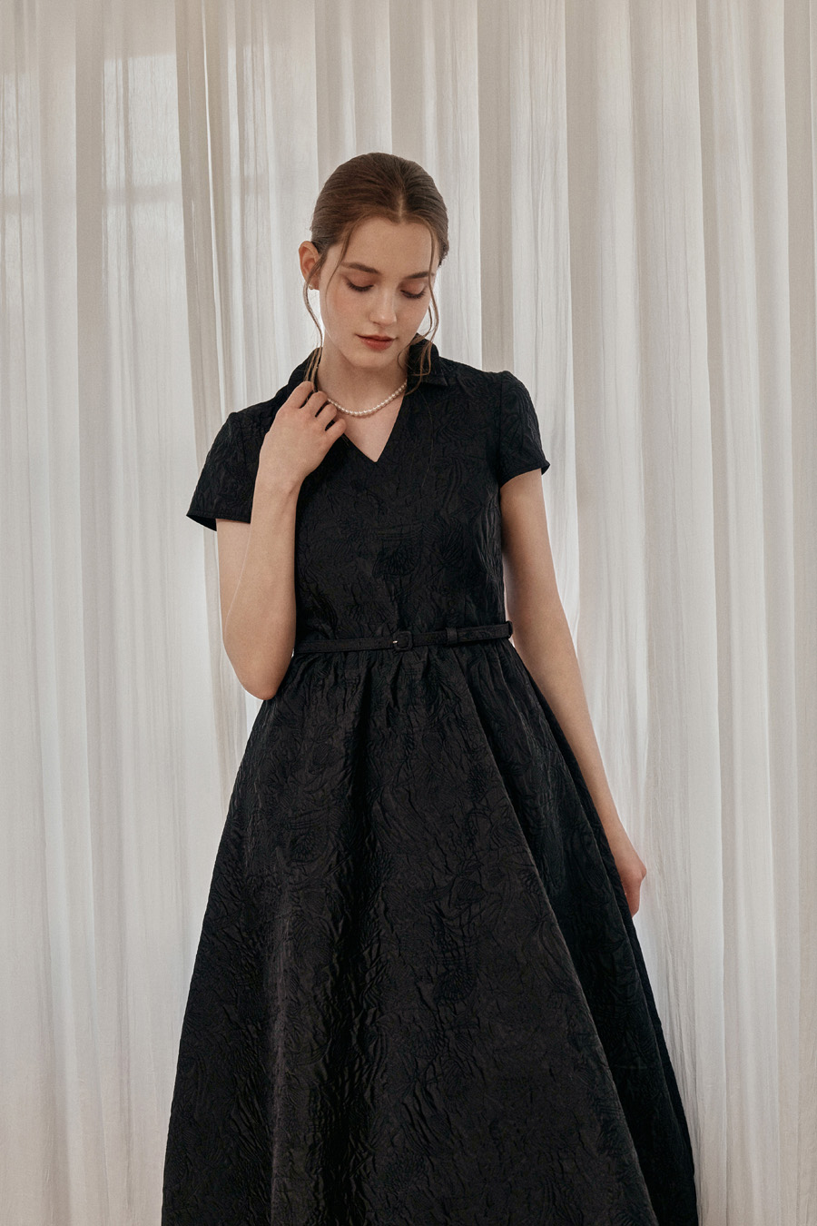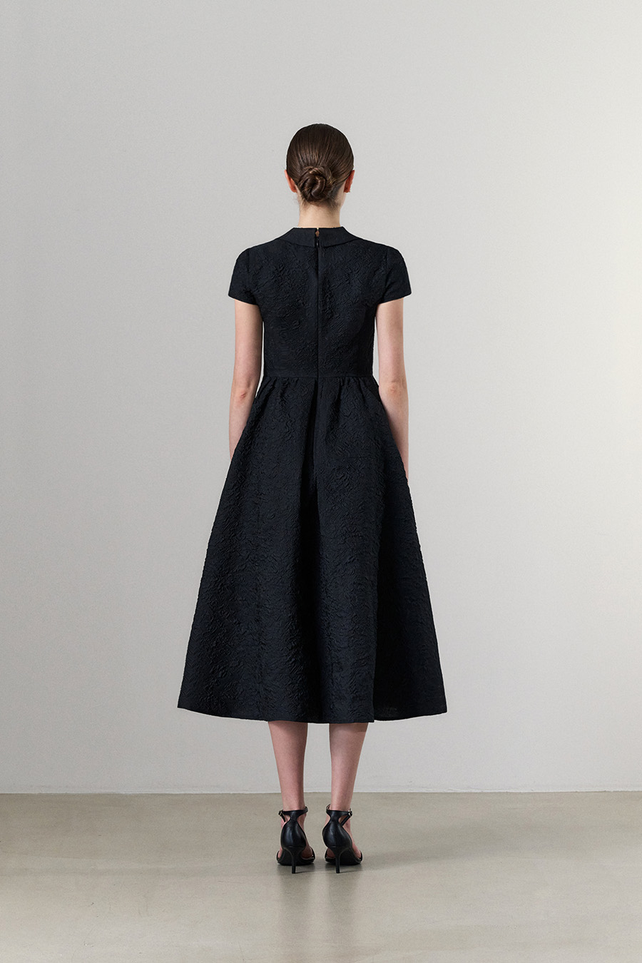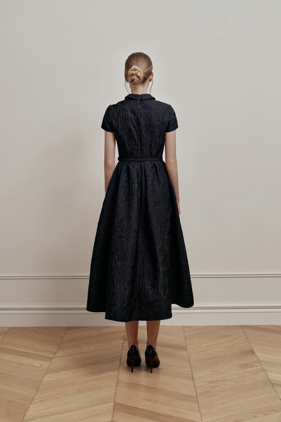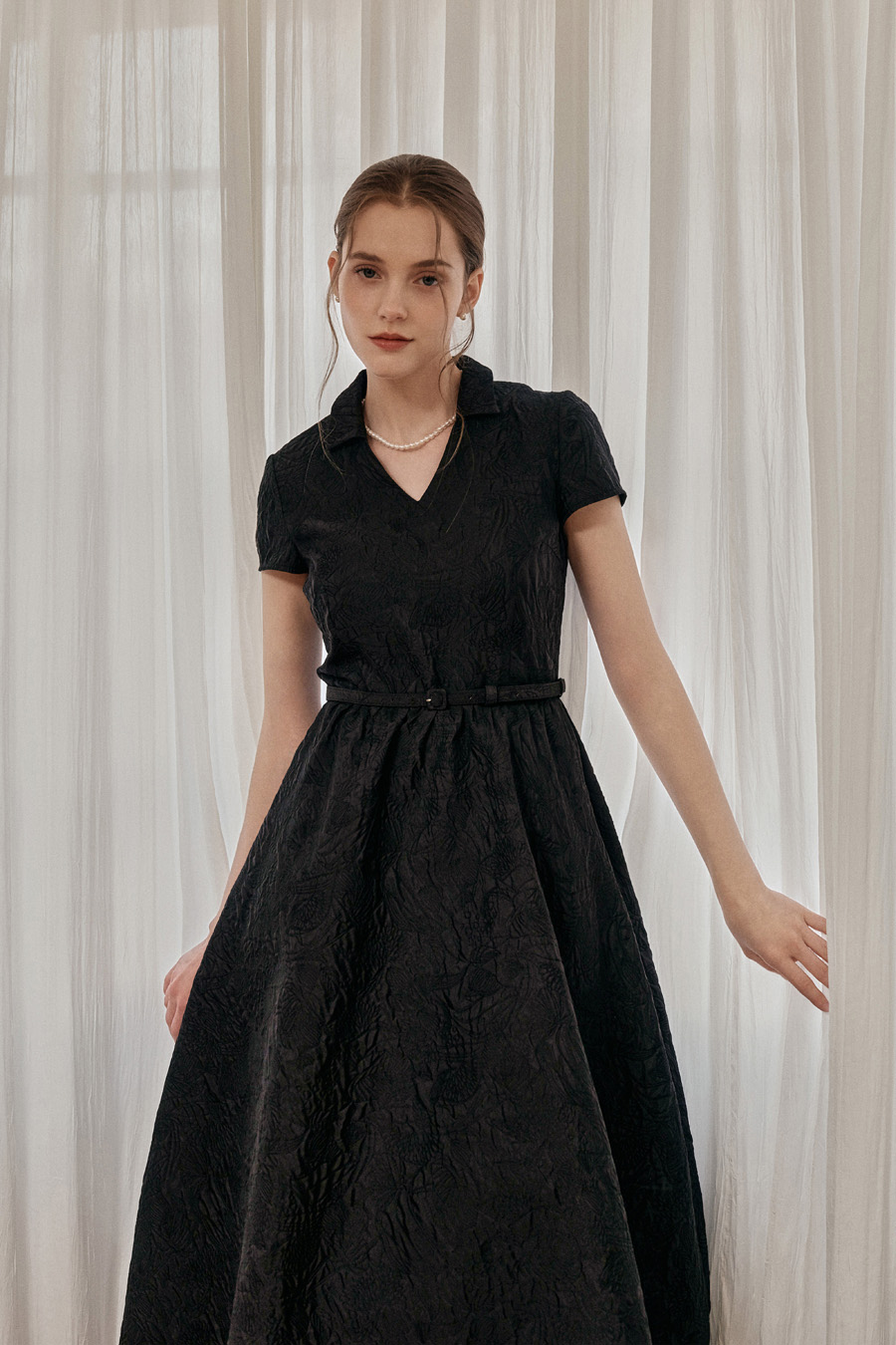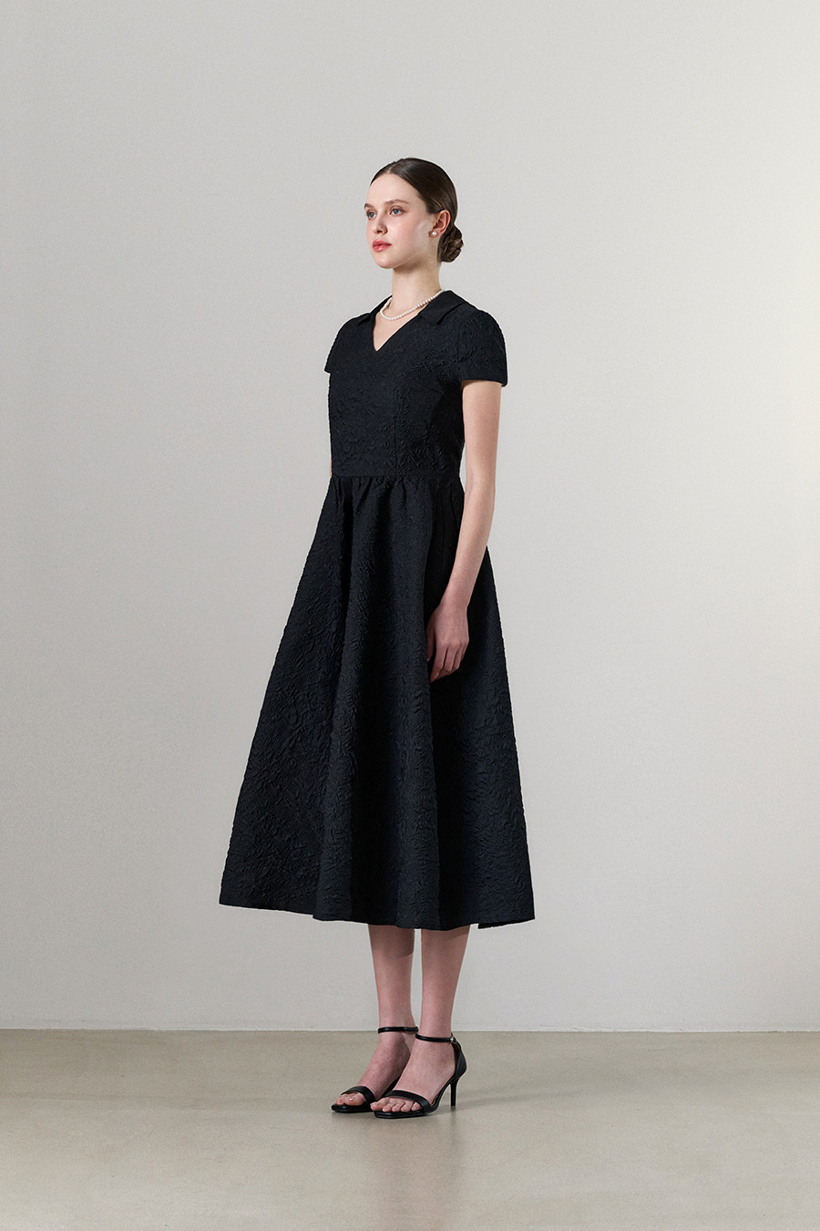 허리선을 따라 잘록하게 잡히는 실루엣과 풍성하게 퍼지는 플레어 라인의 스커트는