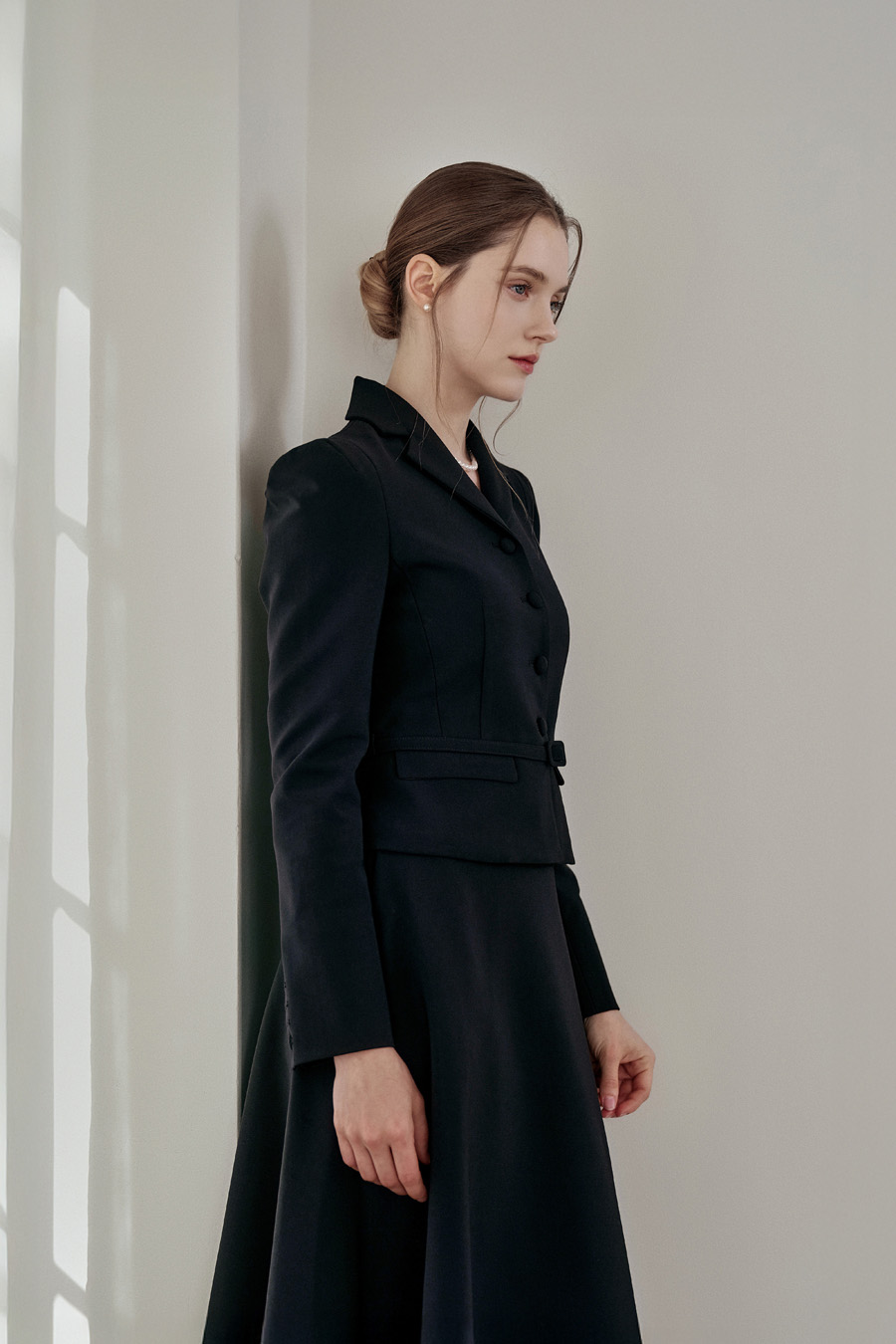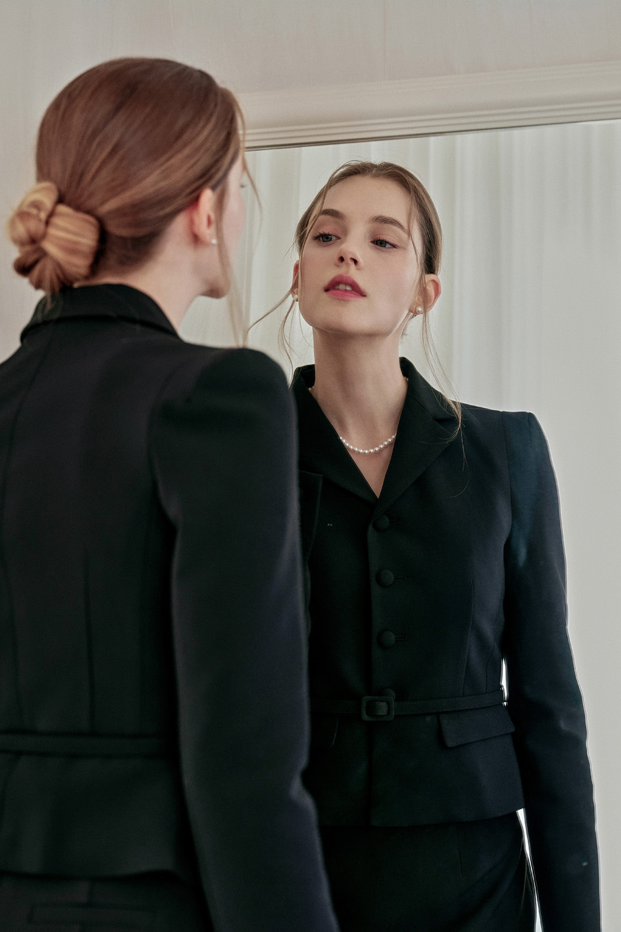 자켓은 잘록한 허리선을 강조하는 입체적 패턴과