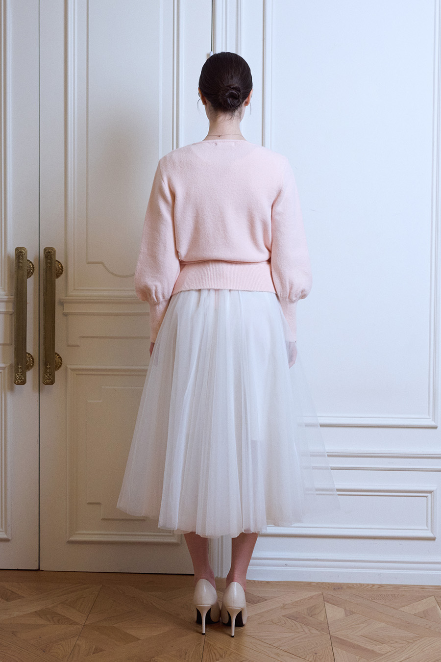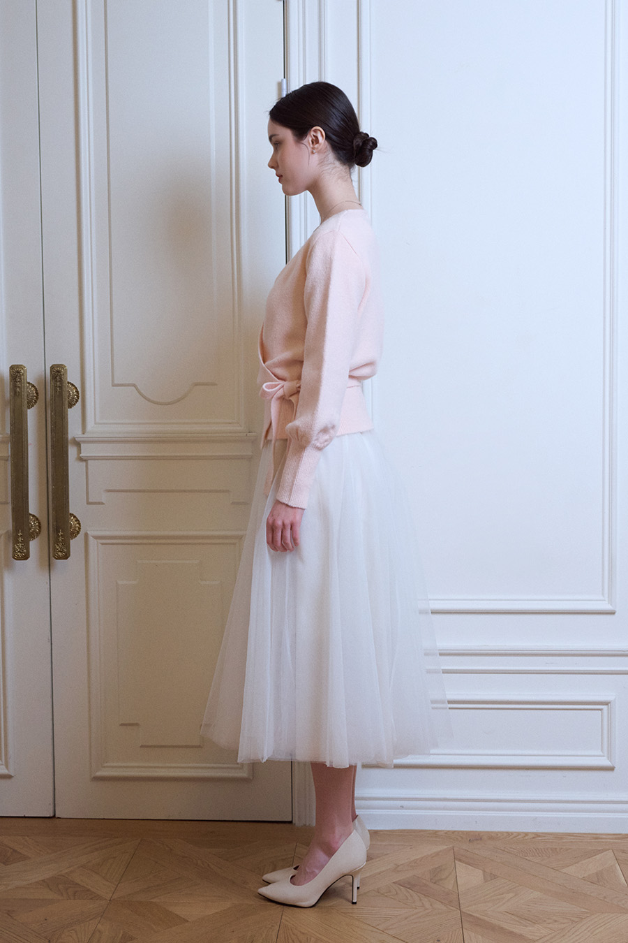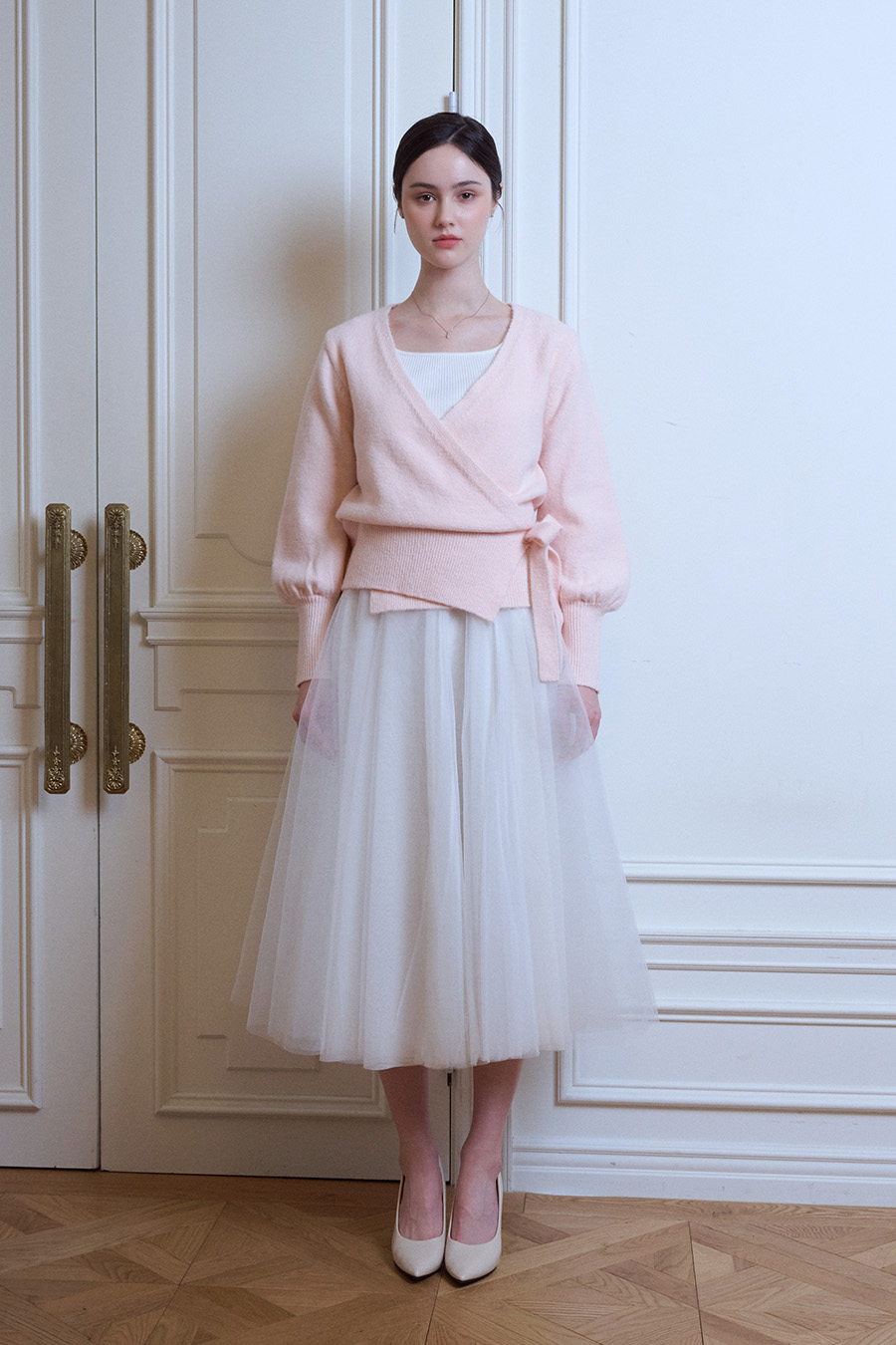 발레리나의 랩 스커트를 모티브로 하여 리본 포인트와 벌룬 소매로