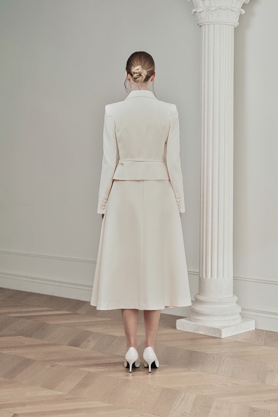허리선에서 자연스럽게 퍼지는 플레어라인은