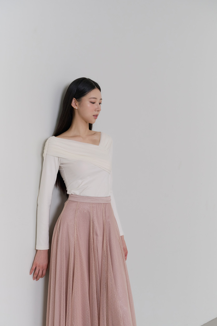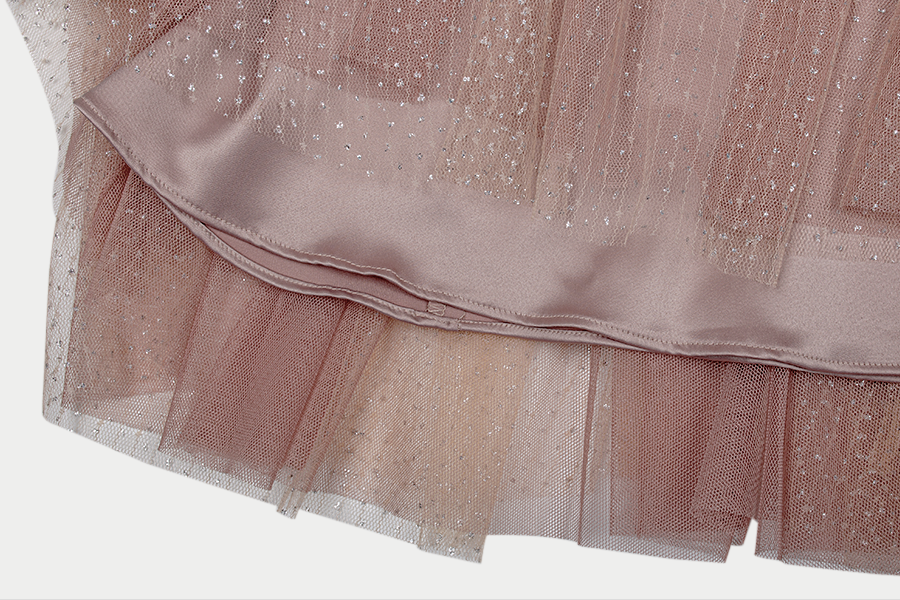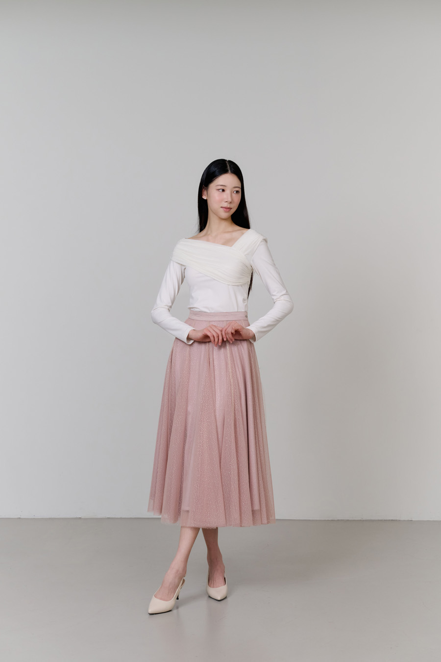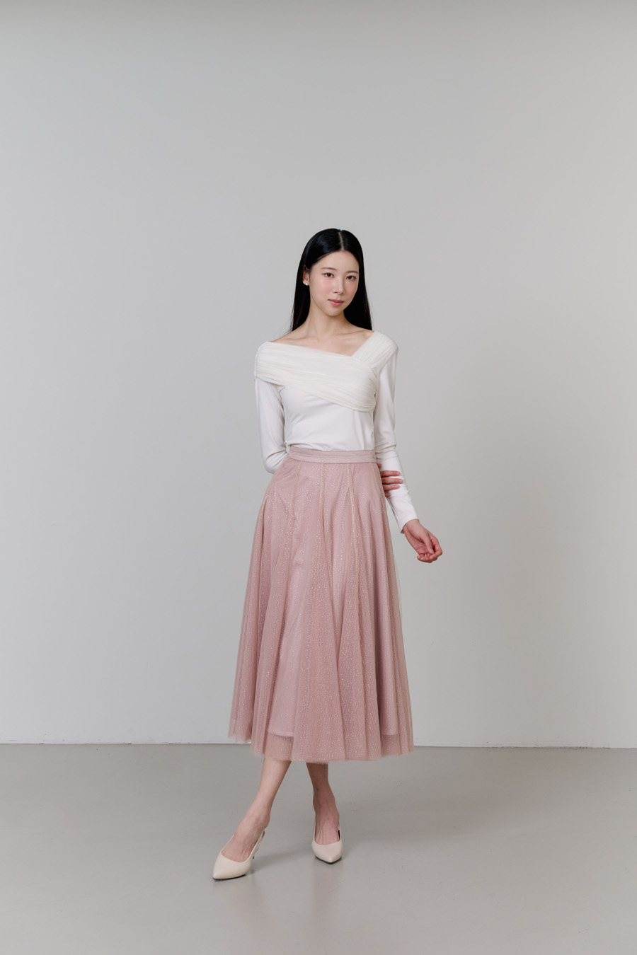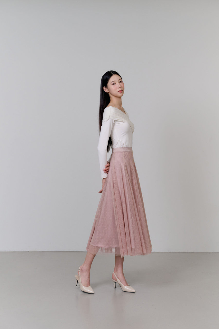 반짝이는 펄 디테일이 더해진 샤 소재가 걸을 때마다 은은하게 빛나며,