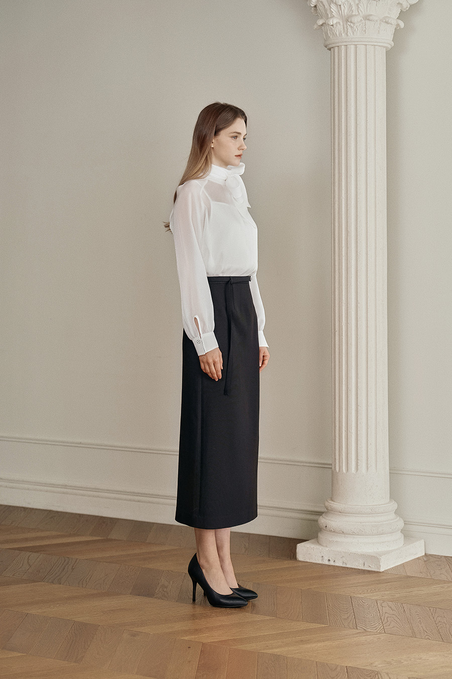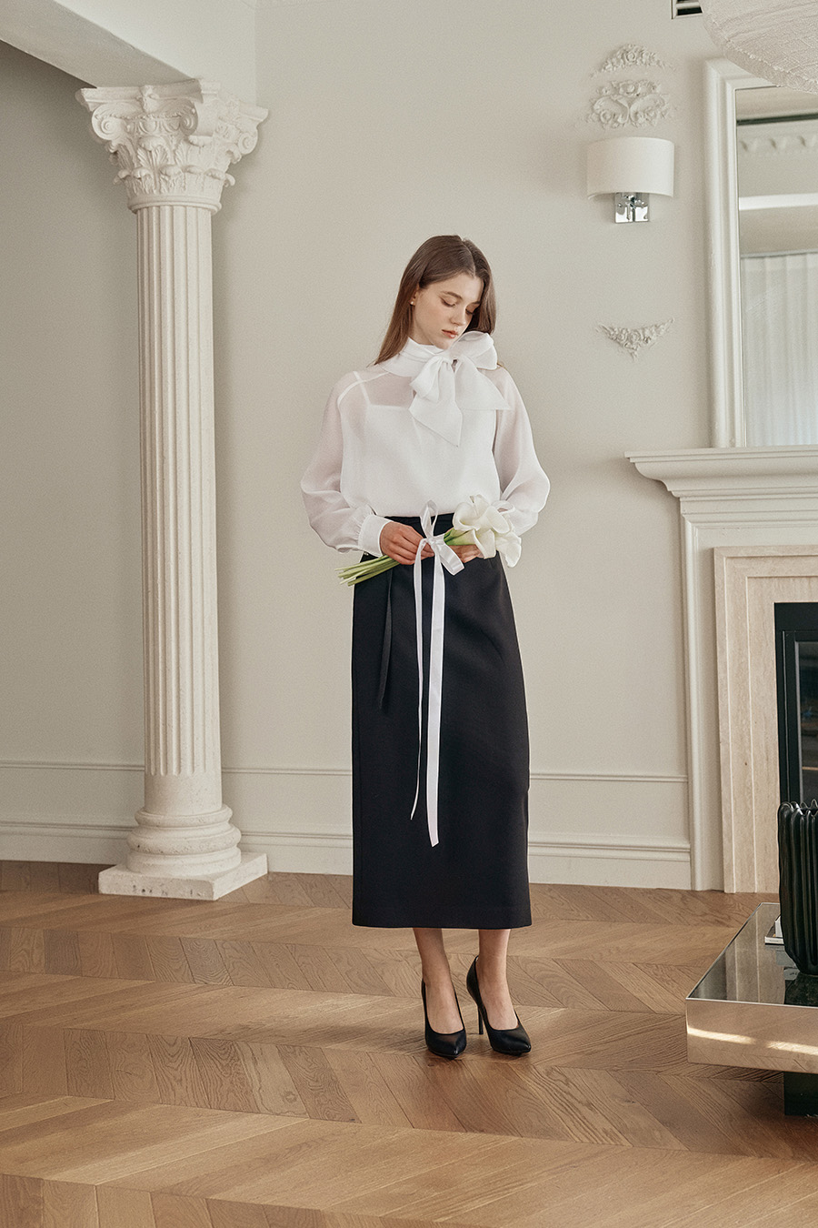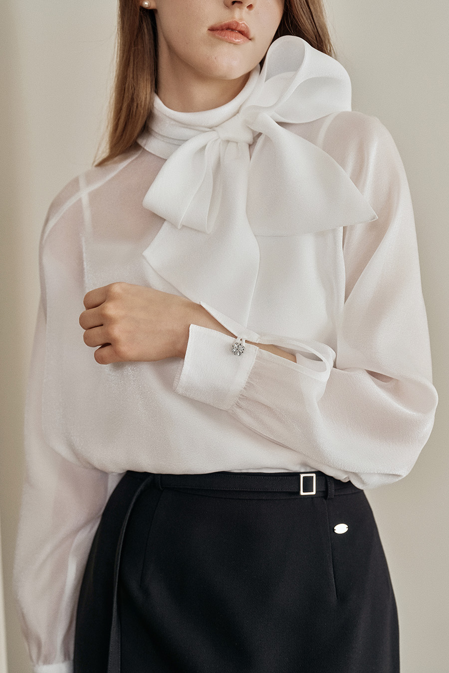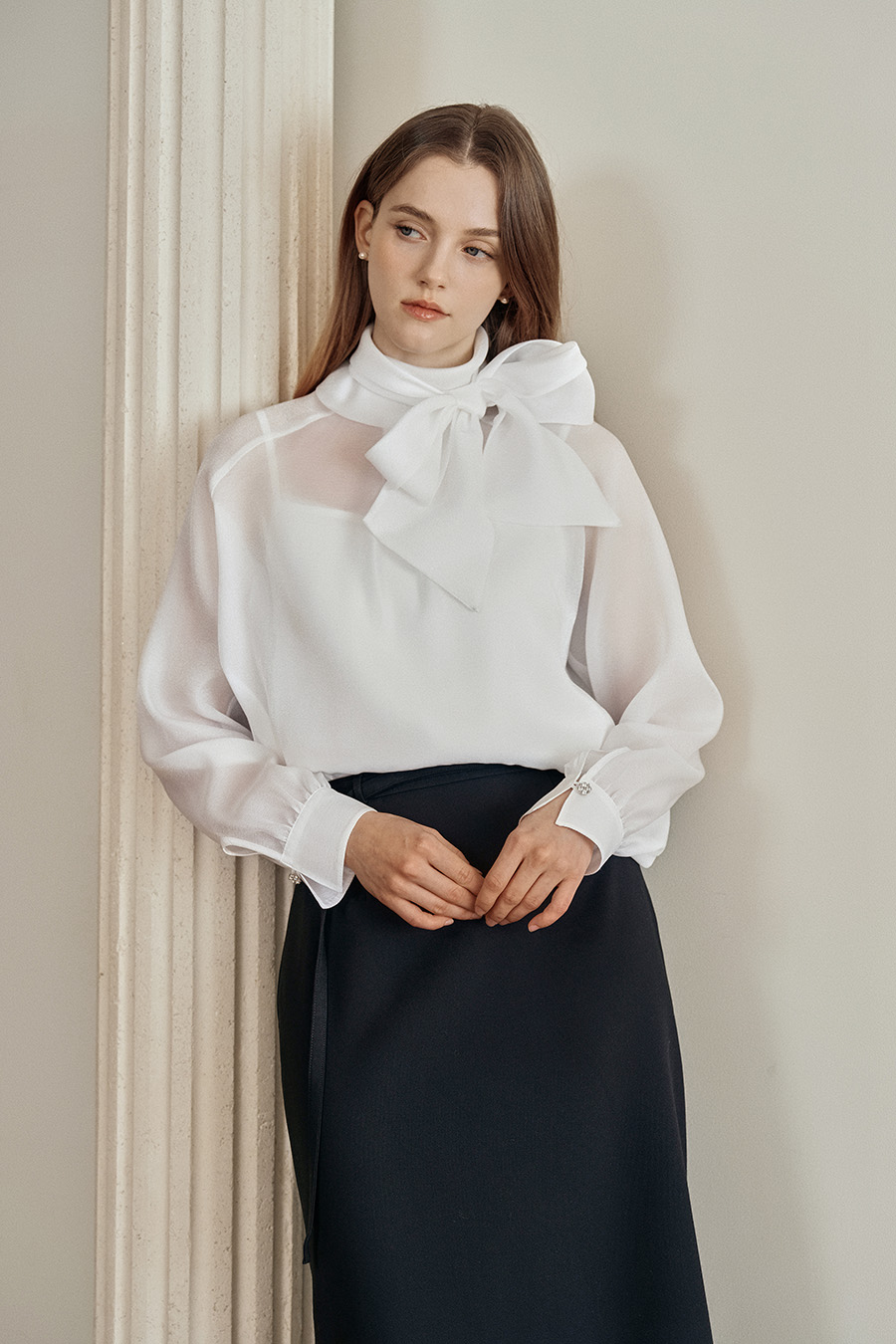 은은한 펄이 더해진 페미닌한 무드의 타이 블라우스입니다.