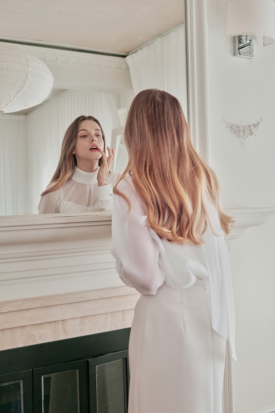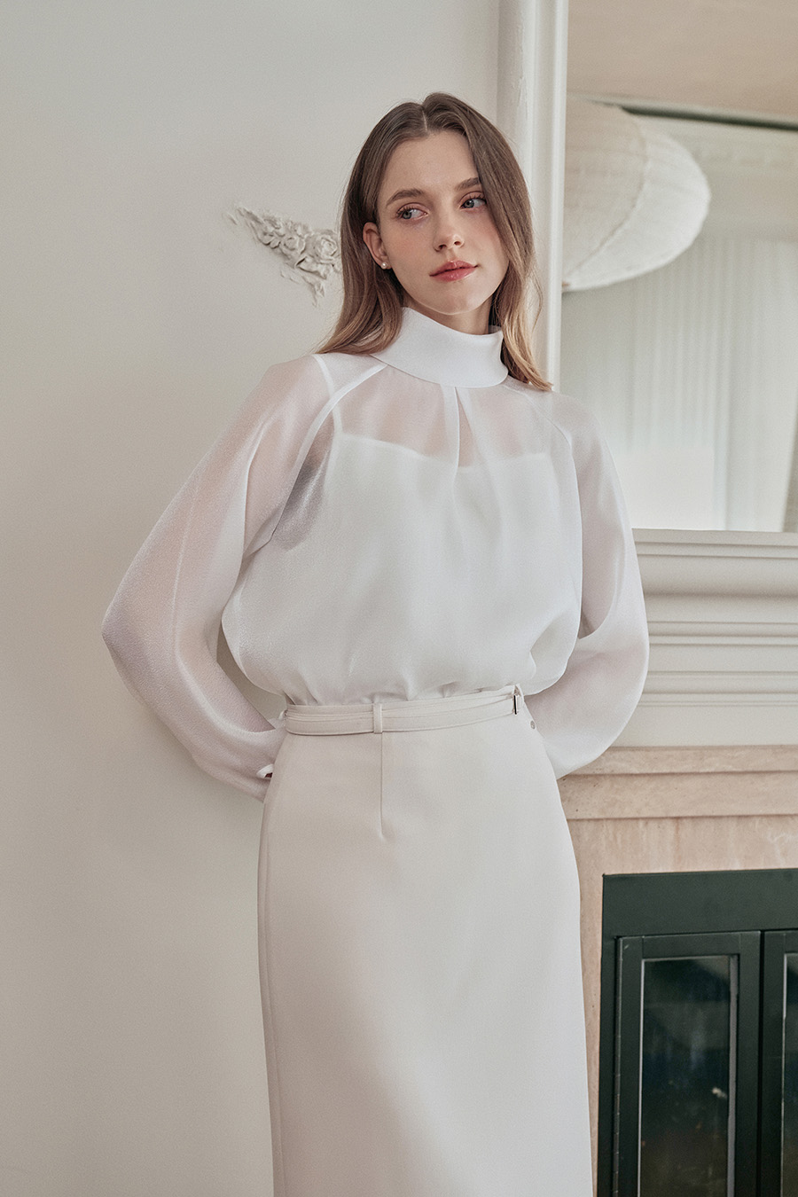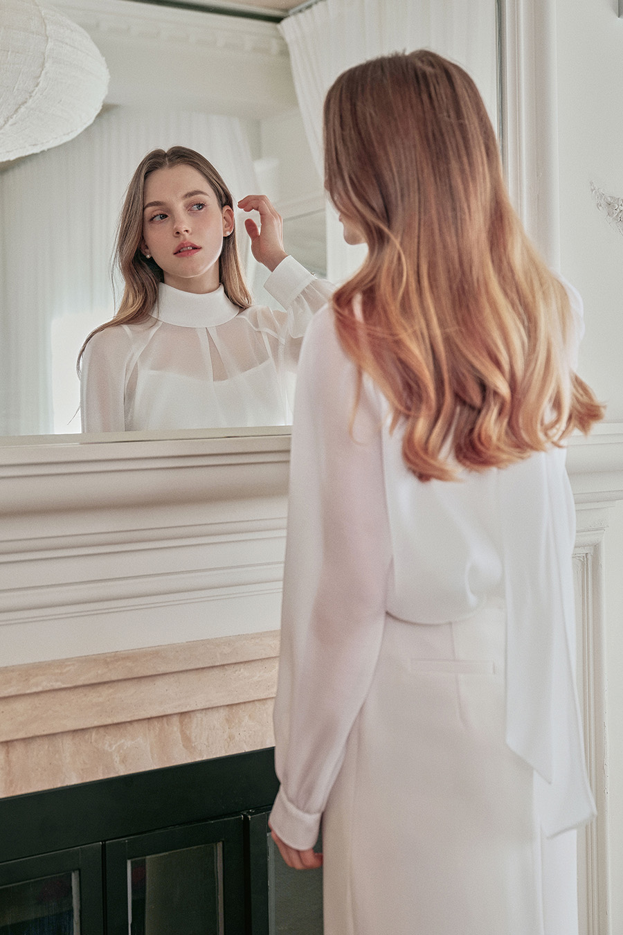 투명하게 빛나는 시어 원단이 피부 톤을 맑게 표현하며,