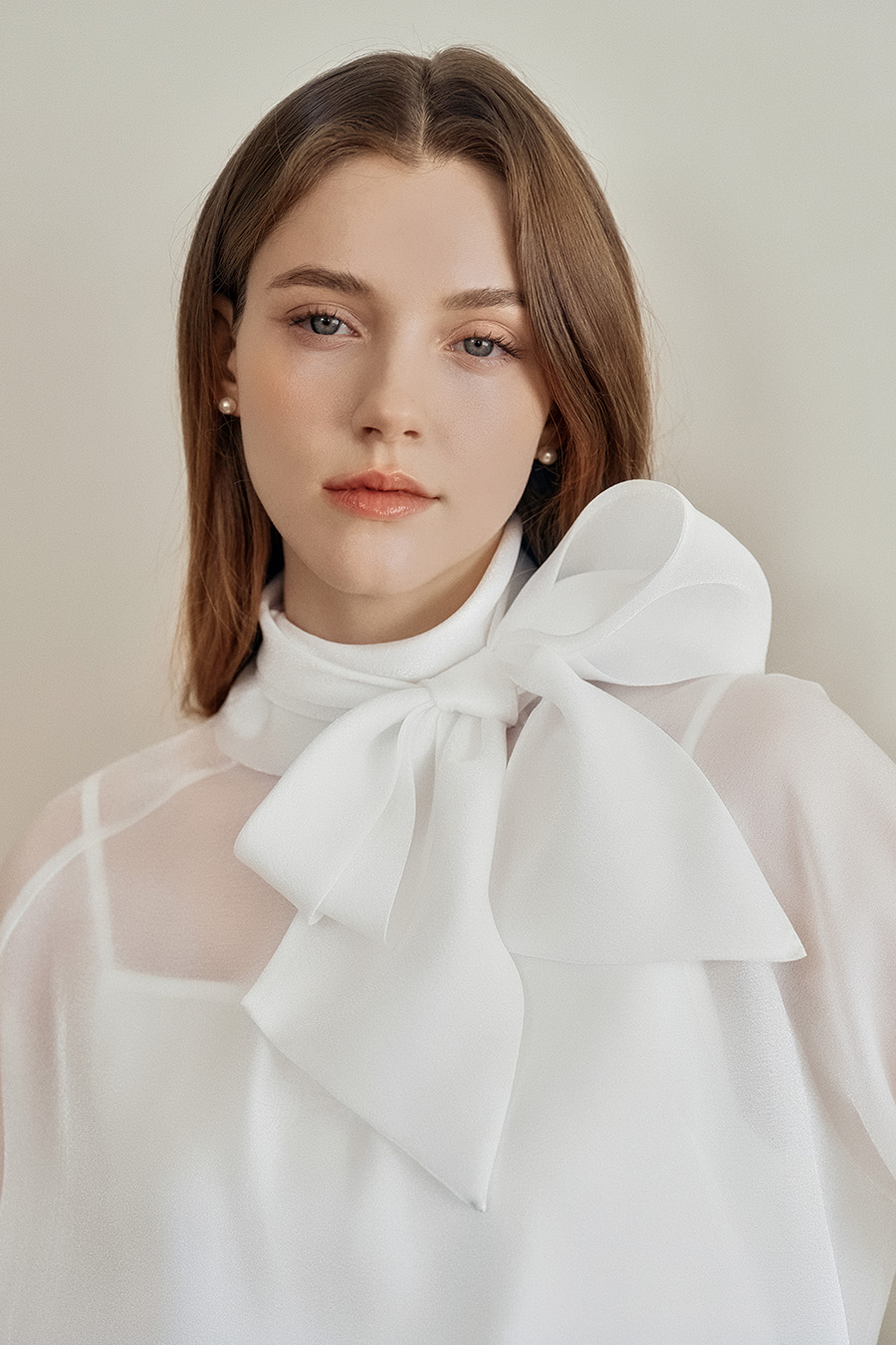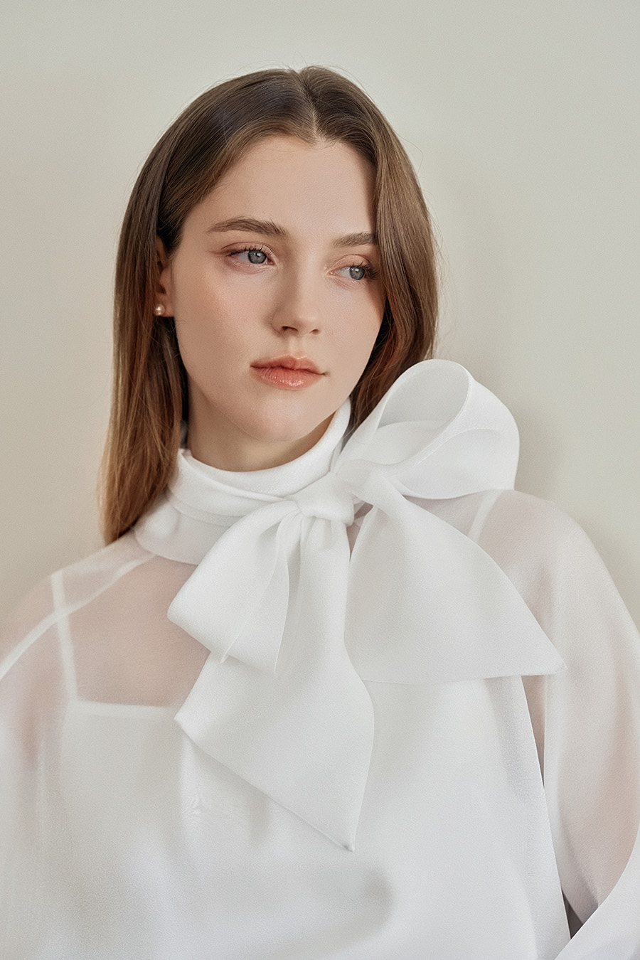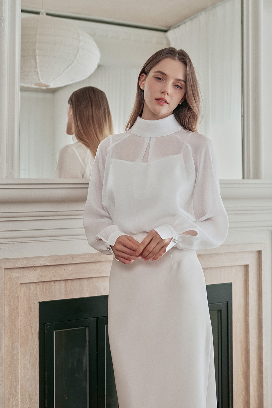 투명하게 빛나는 시어 원단이 피부 톤을 맑게 표현하며,