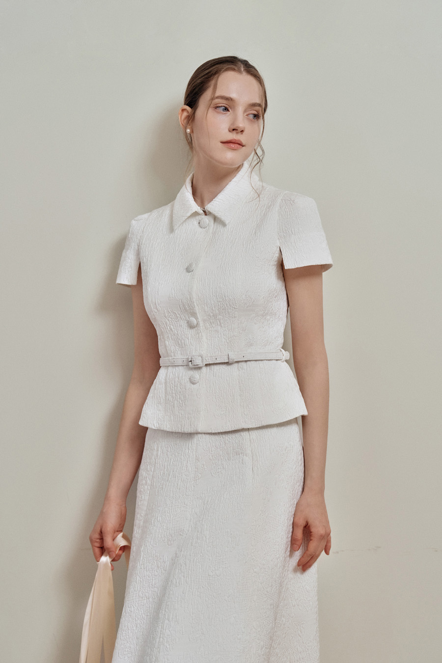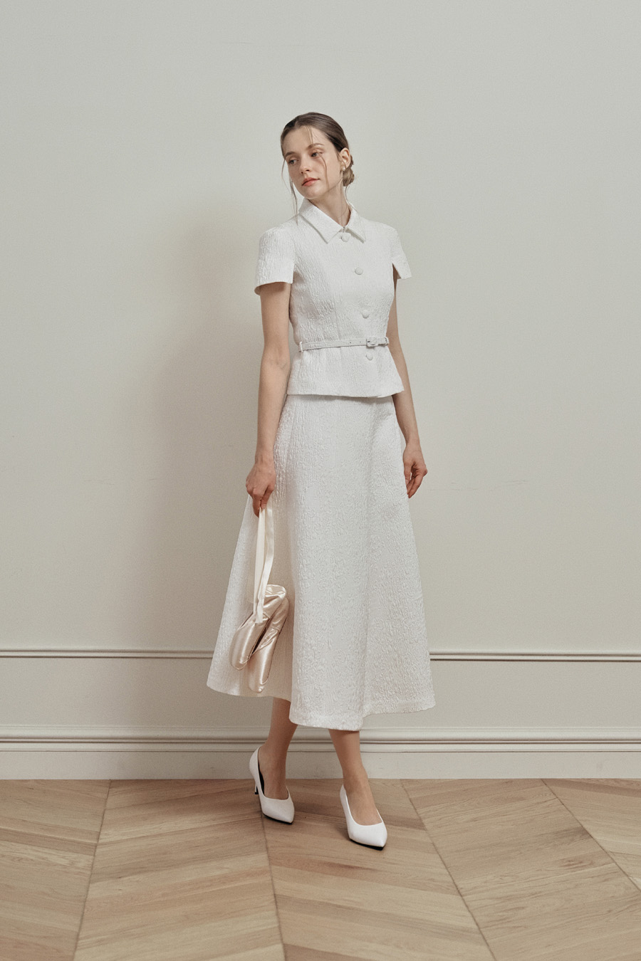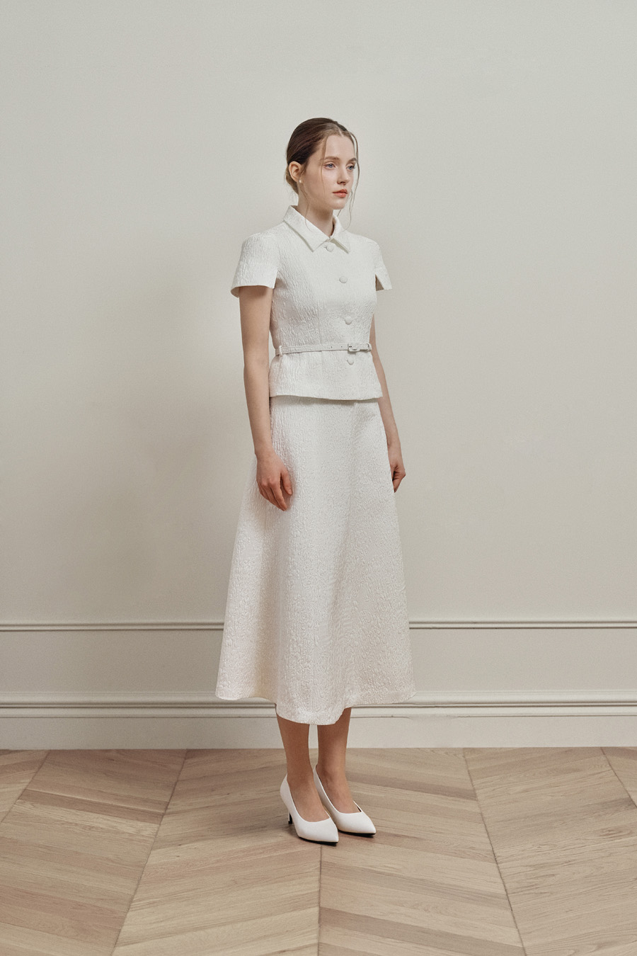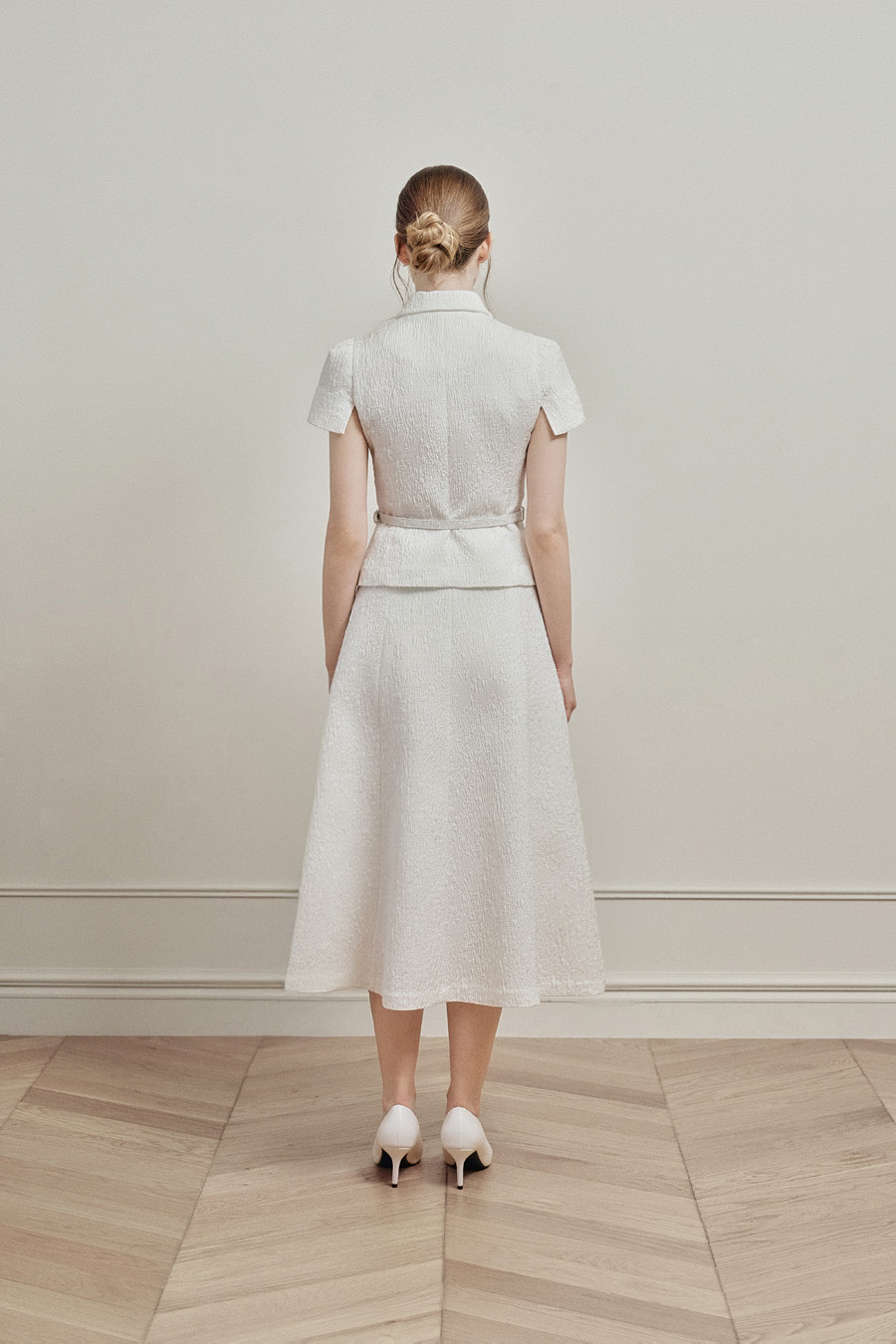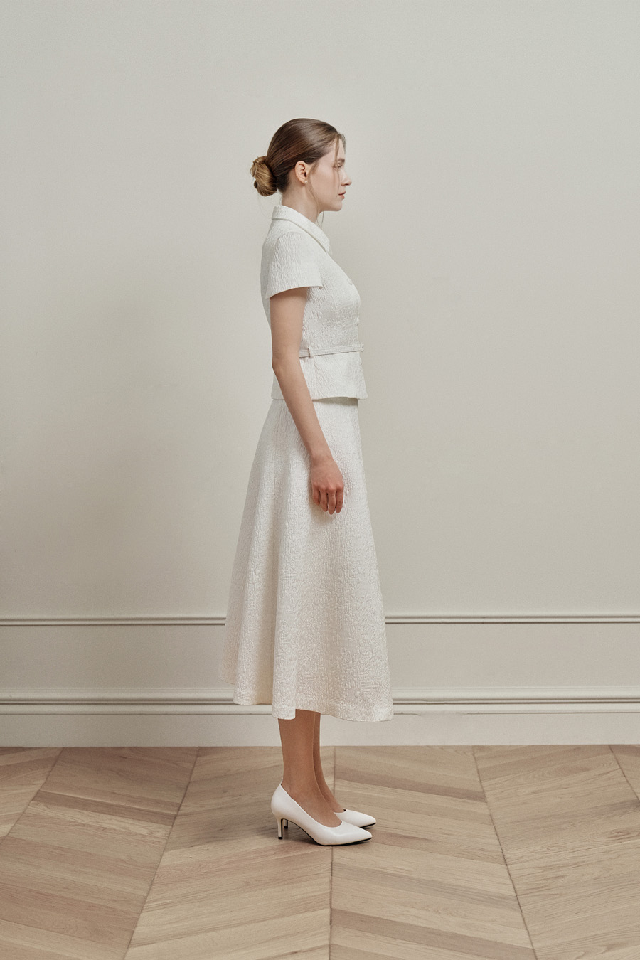 카미유 자가드 소재 특유의 탄탄한 조직감으로 오랜 시간 착용해도 우아한 핏을 유지합니다.