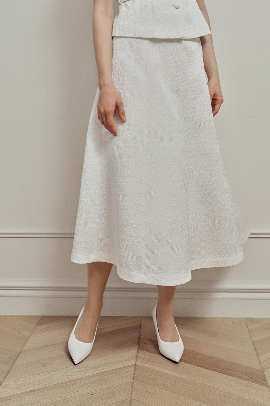 8폭 절개 패턴으로 밑단까지 자연스럽게 퍼지는 플레어 실루엣은 발레리나의 샤 스커트를 연상시킵니다.