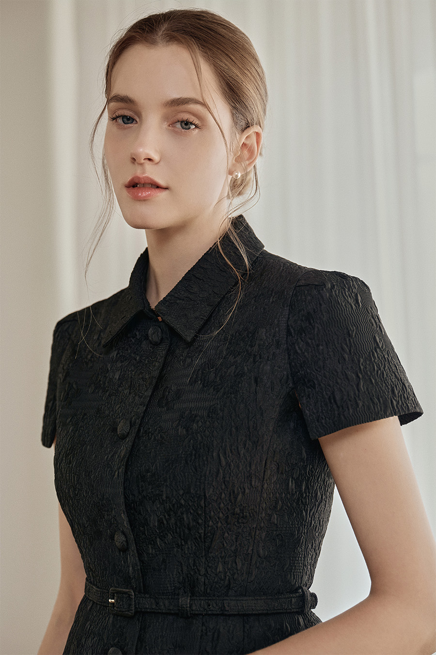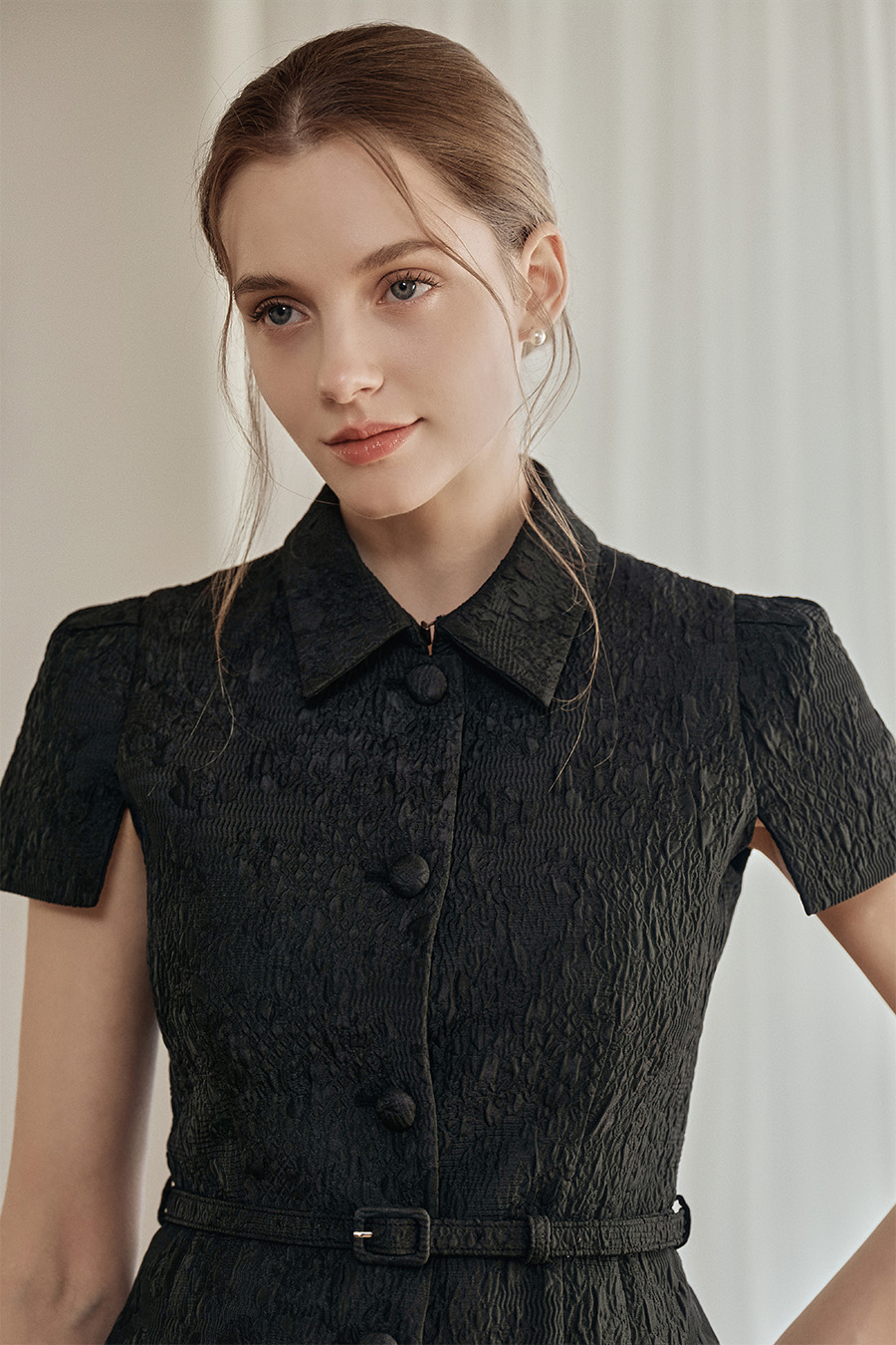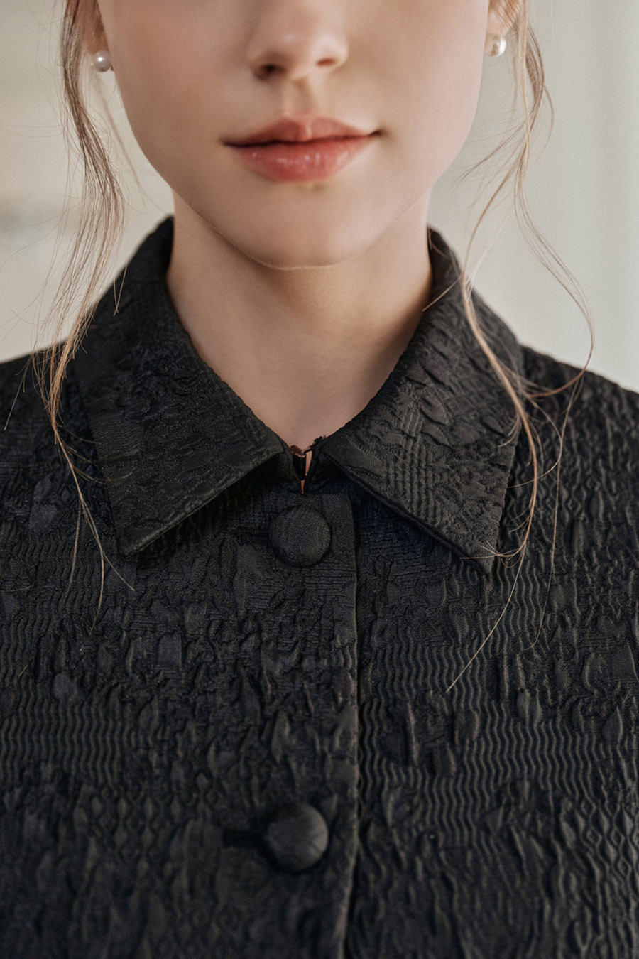 힘 있는 자가드 원단으로 제작되어 여유 있으면서도 슬림한 핏이 단정하게 드러나며,