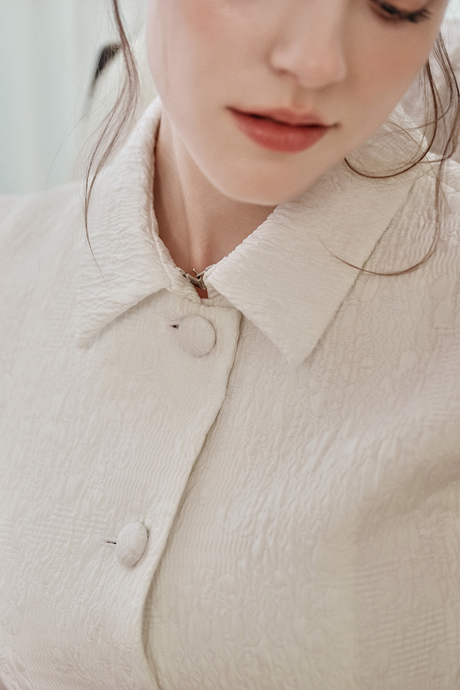 힘 있는 자가드 원단으로 제작되어 여유 있으면서도 슬림한 핏이 단정하게 드러나며,